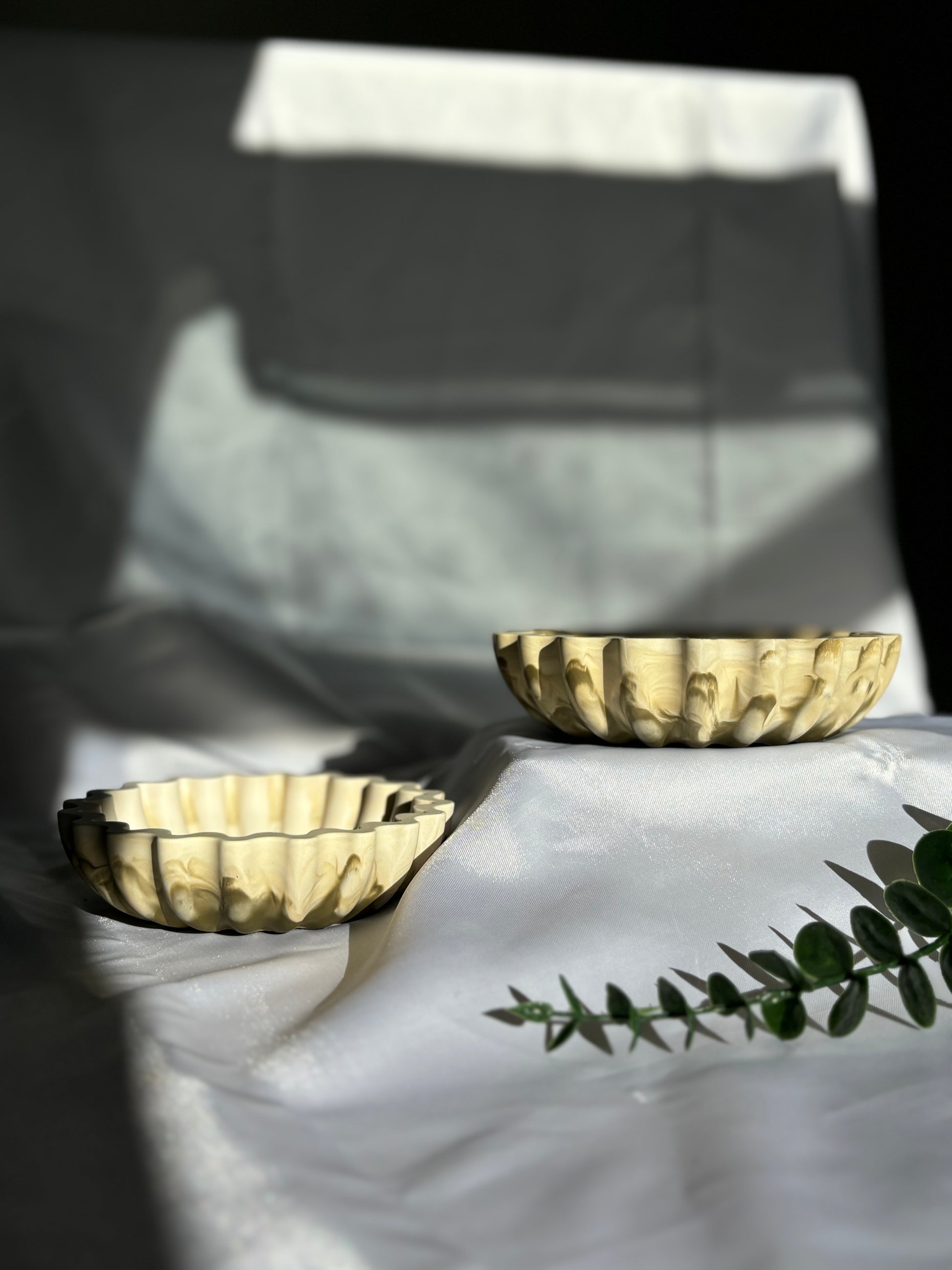 Das Gentle Bowl Set besteht aus zwei handgegossenen Jesmonite-Schalen in harmonisch abgestimmten Größen.