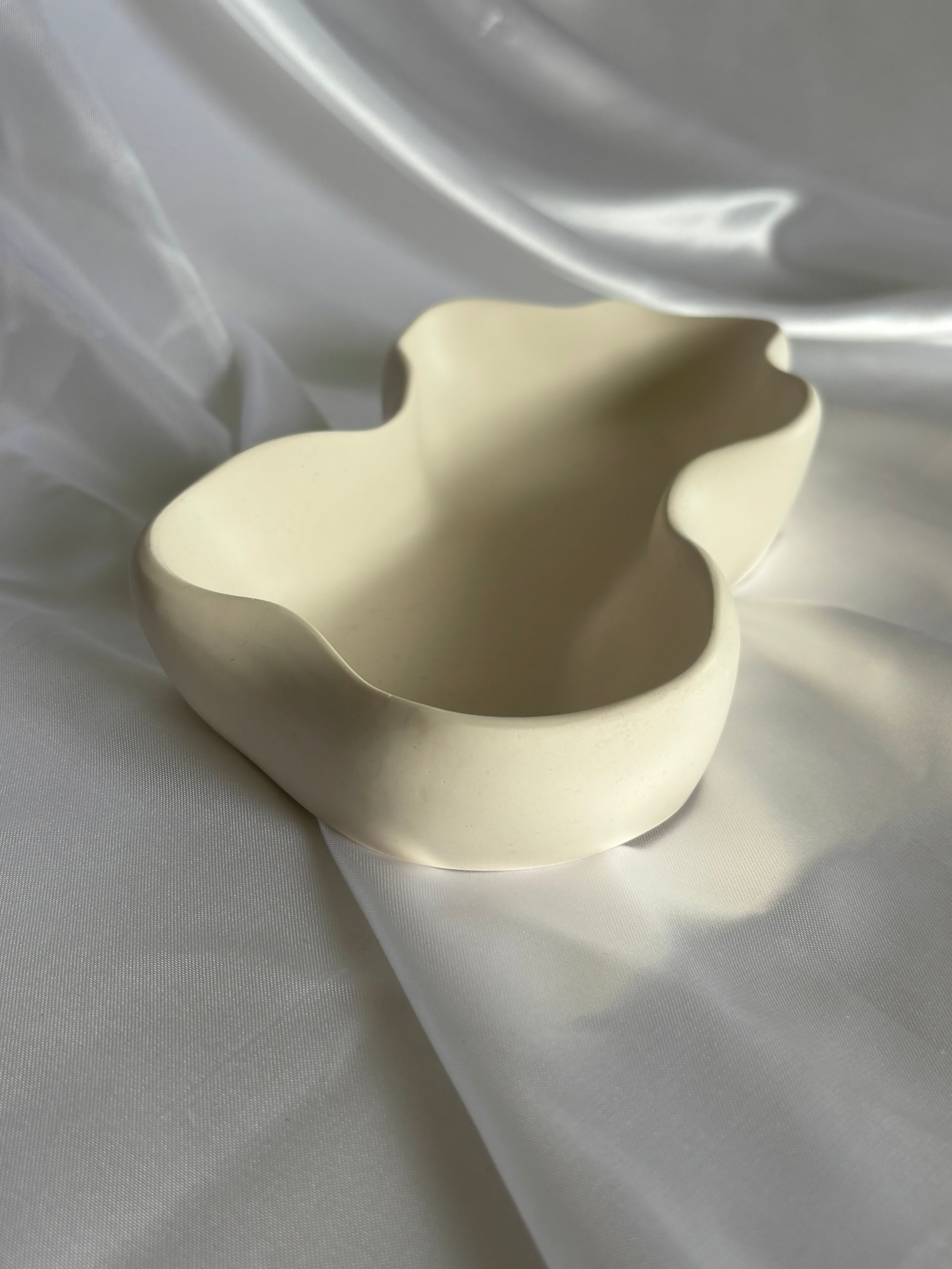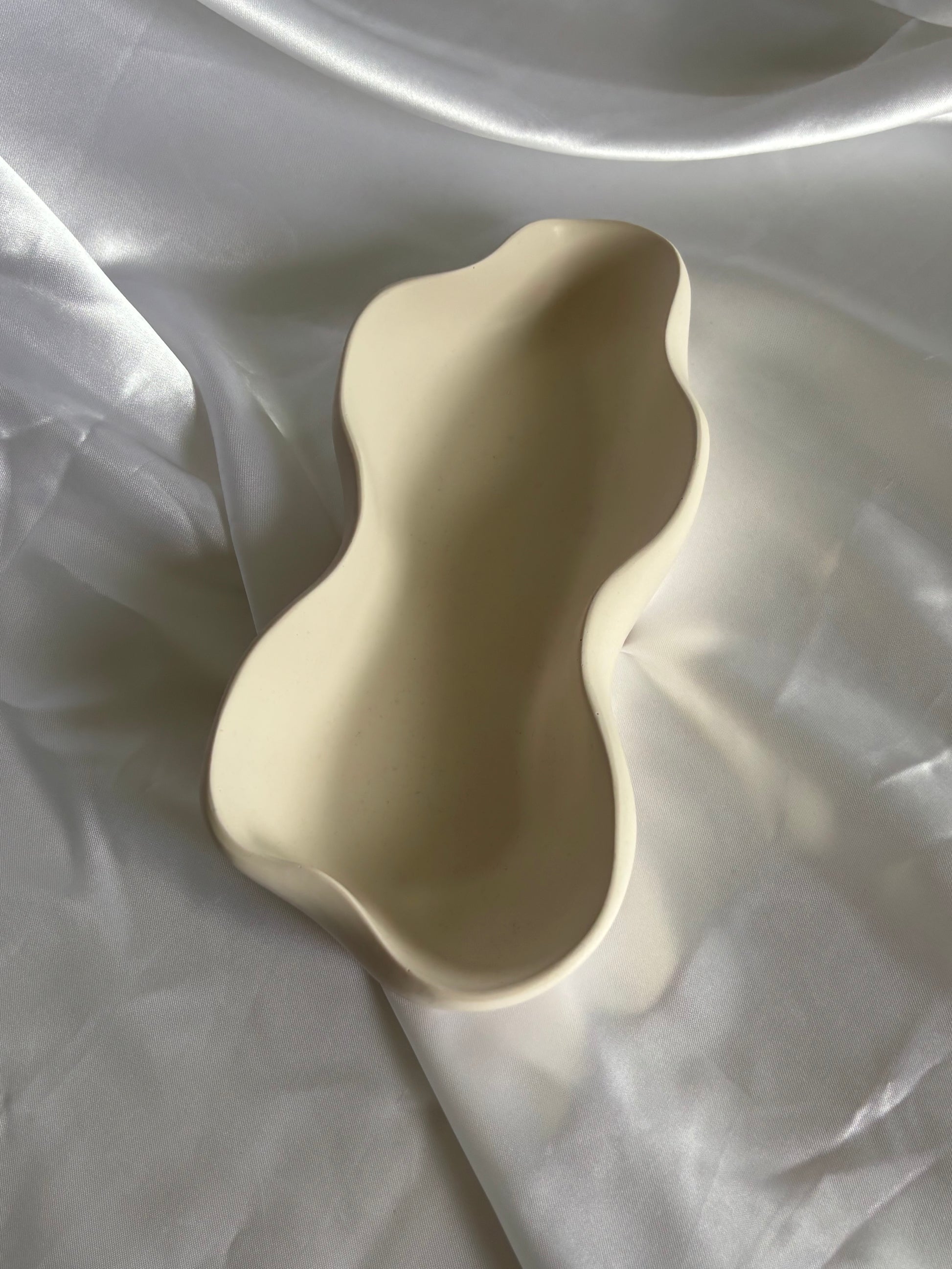 Eine elegante, längliche Schale mit sanften, welligen Konturen, die natürliche Formen nachahmt. Minimalistisch und stilvoll, perfekt für moderne Einrichtungen oder als dekoratives Highlight. Ihre einzigartige Form schafft ein harmonisches Ambiente und setzt zeitlose Akzente in jedem